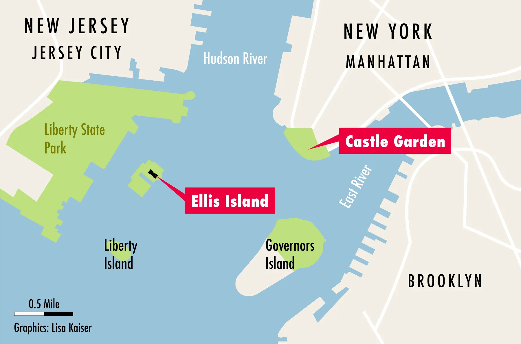 • From Battery Park (Manhattan): board ferries after security screening near Castle Clinton.